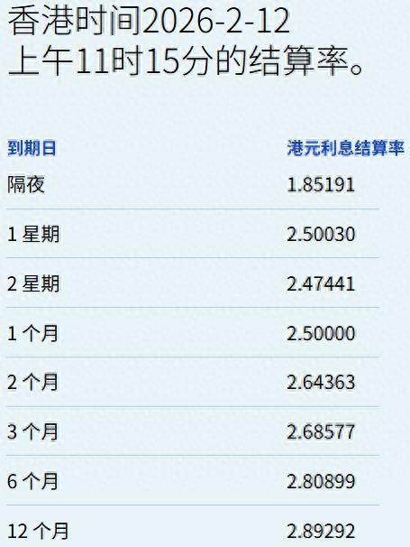 隔夜息报1.85191%,升5.262基点;一周拆息升7.768基点,报2.5003%,两周则升5.012基点,报2.47441%。长息方面,六个月拆息跌0.286基点,报2.80899%,一年期则跌1.964基点,报2.89292%。